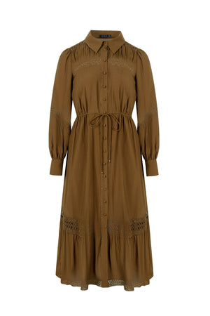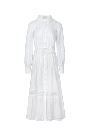 This is an elegant and romantic button-up midi dress with delicate lace detailing, evoking a timeless, vintage-inspired charm. It blends bohemian grace with classic tailoring, making it a versatile wardrobe piece for various occasions.-Lined