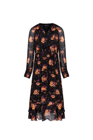 Viscose gives it a breathable quality with a silky touch, mimicking the feel of natural fibers like silk but at a more wearable weight.Covered in a warm-toned floral print, isla dress features blooms in shades of burnt orange, saffron, dusty pink, and muted lavender—all arranged in a scattered yet intentional pattern. A relaxed A-line silhouette with a gently flared hem, perfect for movement and grace.Features a rounded neckline with a subtle V-slit opening, adorned with a tassel-tie detail that adds a boho-chic flair. - Lined