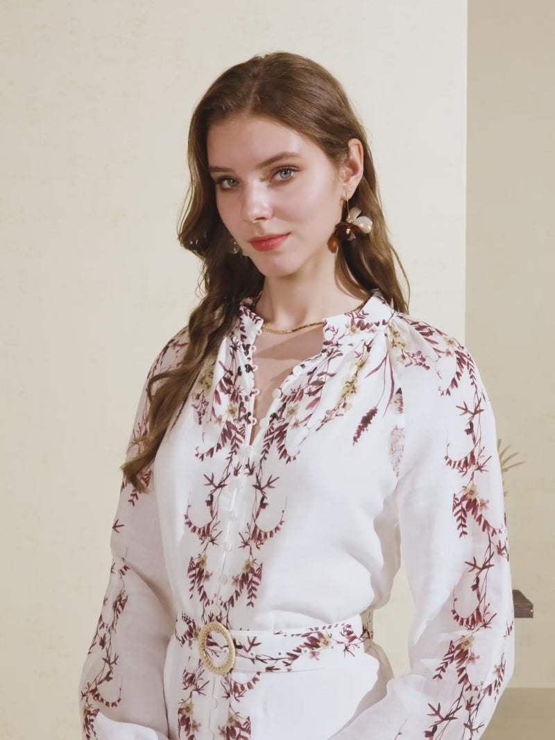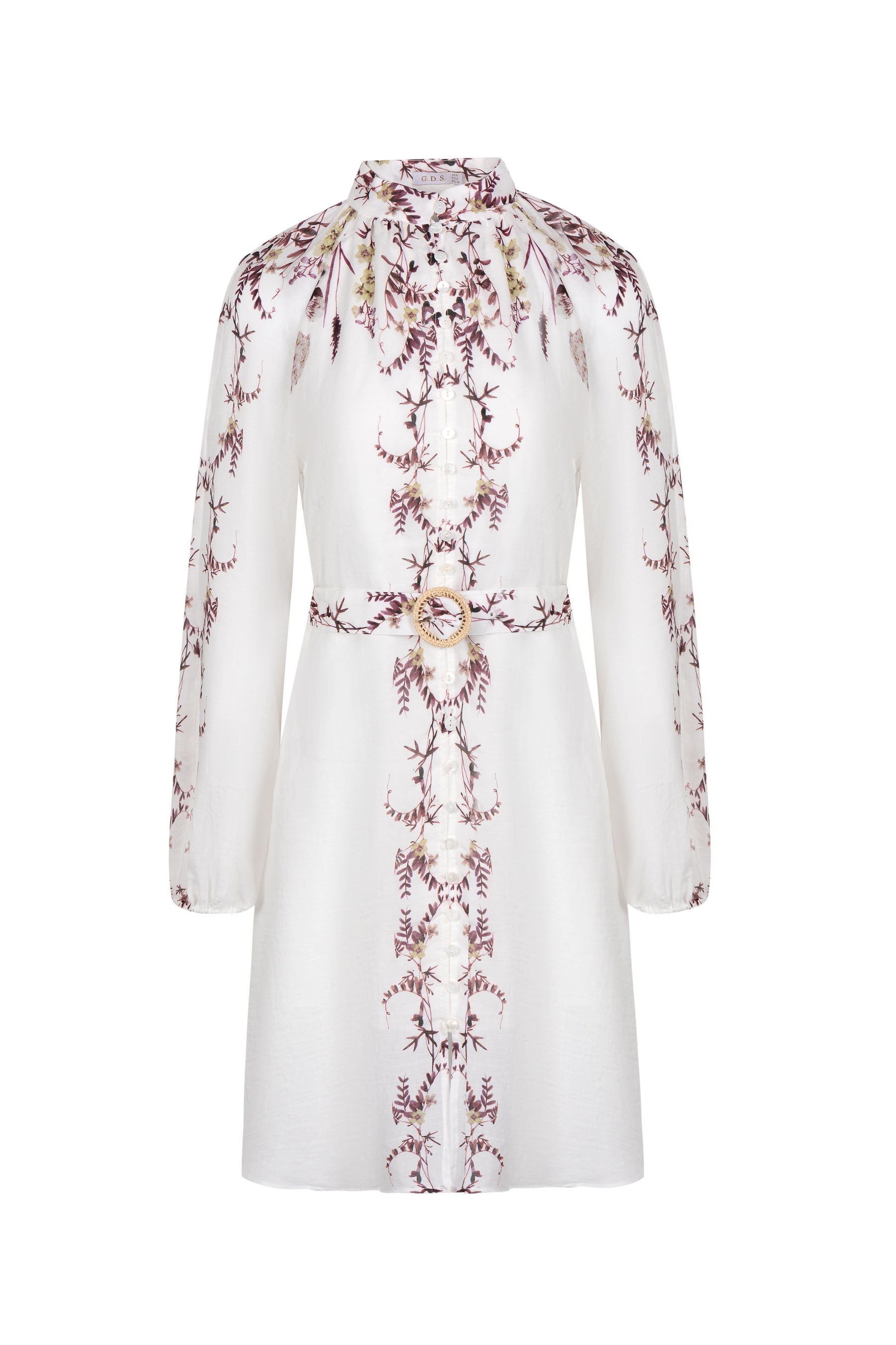 Tencel gives the dress a smooth, silky hand-feel and fluid drape. Linen adds a natural texture with breathable, lightweight qualities that make the dress ideal for warm climates. A coordinating fabric belt cinches the waist, accentuating the silhouette. The belt is printed to match the rest of the dress, seamlessly blending into the overall design. - Lined