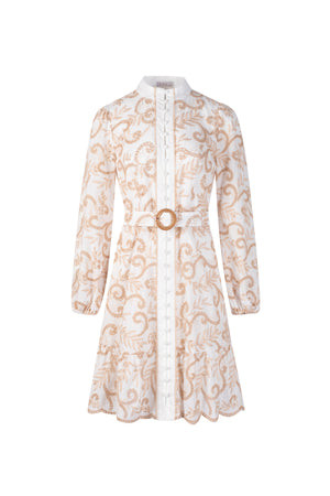 Lucia dress image showcases a cotton dress with exquisite green embroidery on a white background, giving it a fresh and elegant look. The intricate embroidered patterns feature swirling vines and botanical motifs, adding a sophisticated texture to the design. The hemline is scalloped and embroidered, enhancing its delicate and feminine appeal. The lightweight cotton fabric ensures breathability, making it ideal for daytime or semi-formal events. - Lined