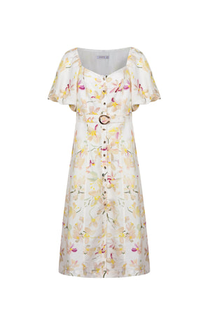 Zoey is a feminine, mid-length dress crafted from a blend of linen and rayon, offering a soft yet breathable texture with a graceful drape. The fabric features a light ivory base adorned with a delicate watercolor-style floral print in soft pastel shades — buttery yellows, blush pinks, lilacs, and hints of green — creating a fresh, romantic, and spring-like aesthetic. - Lined