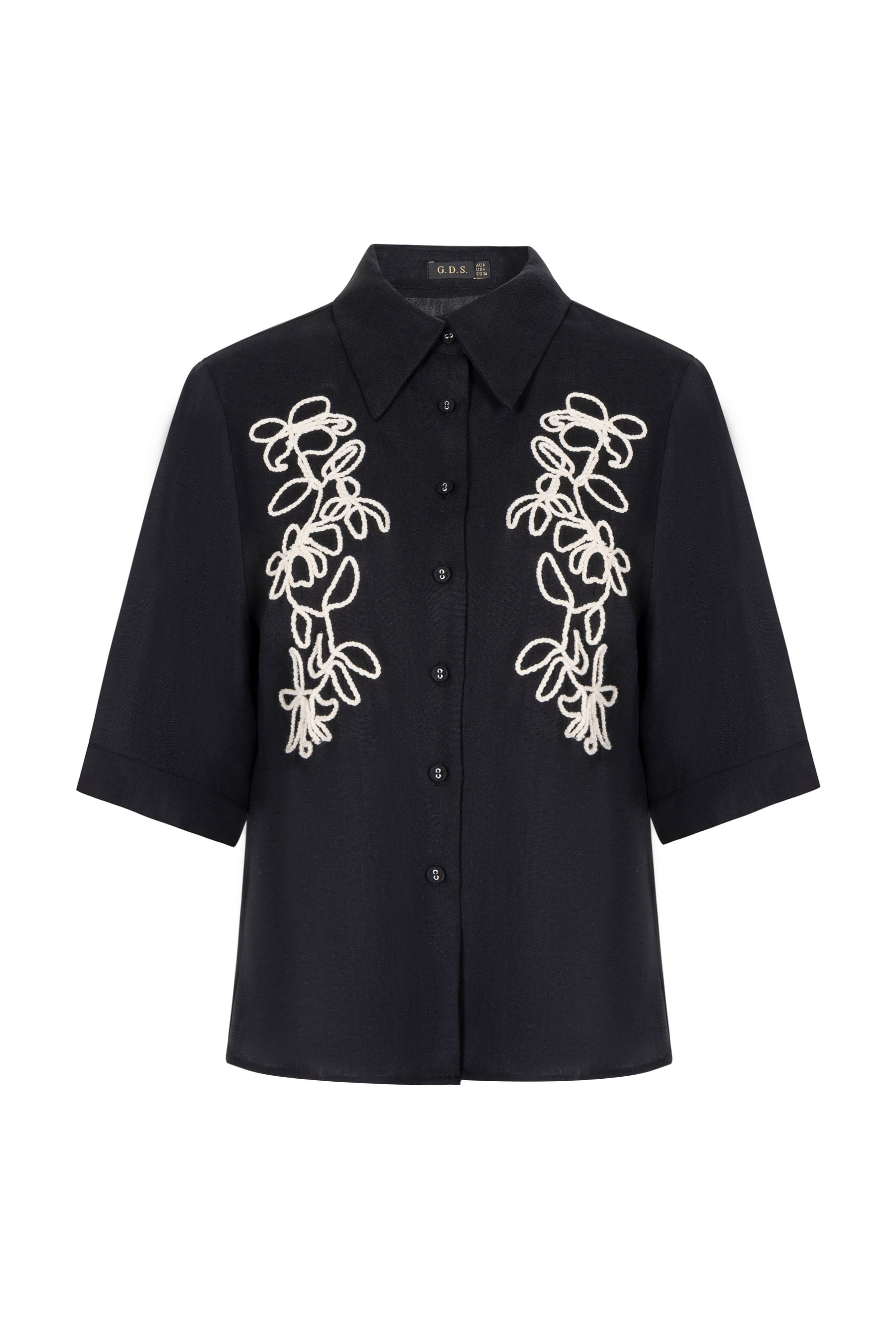 Autumn top merges the breathability of natural fibers with the smooth, flowy qualities of tencel and viscose, resulting in a refined yet relaxed summer wardrobe staple. Features large, abstract floral embroidery in a rich camel or taupe tone, symmetrically placed down the front of the shirt. The embroidery style is slightly three-dimensional and textured, adding visual depth and artisanal character.