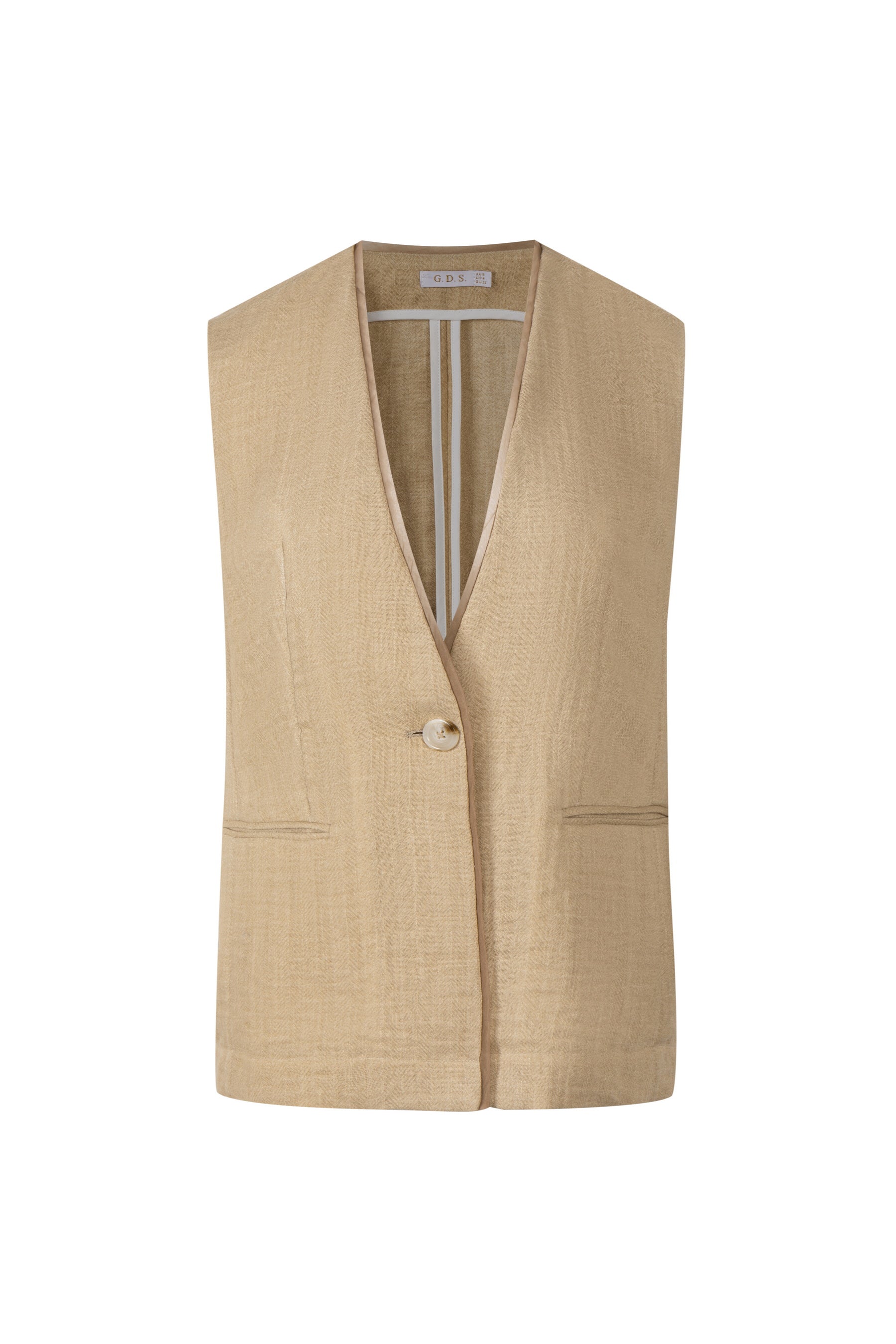 Camilla vest features a deep V-neckline, leading to a single-button front closure with a small, round, light-toned button that matches the garment's color palette. This design accentuates the neckline and creates an elongated, elegant visual effect.
