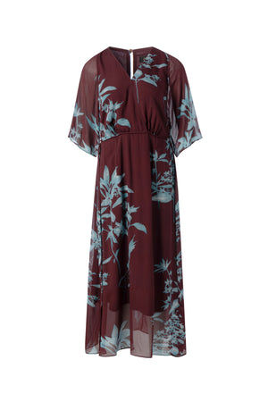 Made from viscose, the fabric is lightweight, breathable, and drapes beautifully. It has a smooth hand feel with a gentle sheen, perfect for creating an airy, fluid silhouette. The base color is a rich, deep burgundy, adorned with a contrasting floral print in a soft turquoise blue. The large-scale botanical motifs add a striking, artistic effect. The neckline is a V-shape with a wrap-style bodice, offering a flattering and elongating effect. - Lined