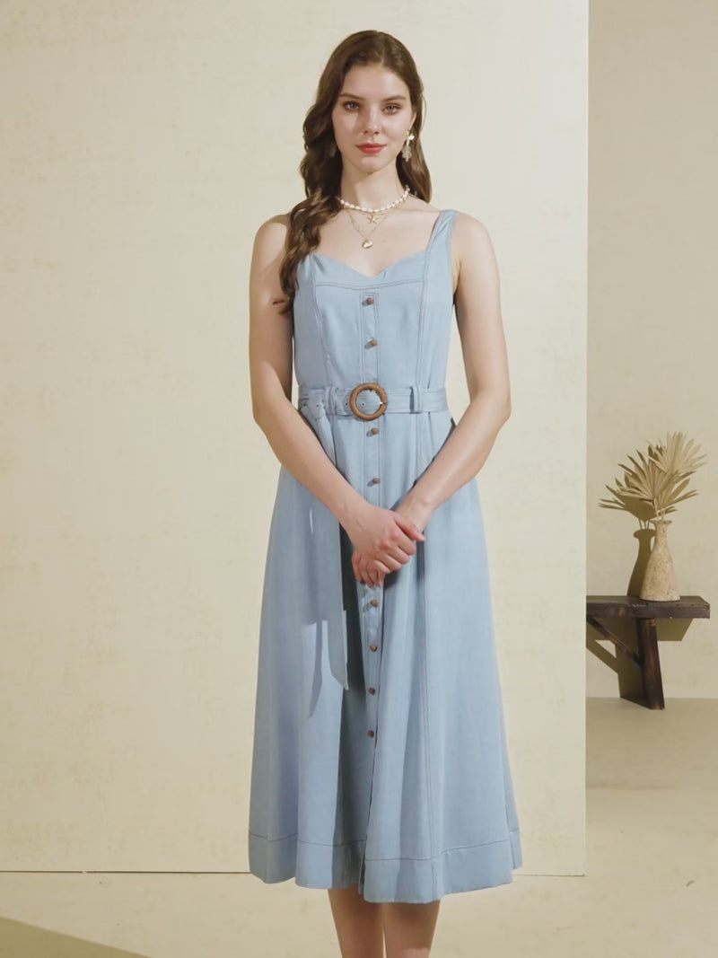 The neckline is a subtle sweetheart shape, softly curved and flattering to the décolletage. The wide shoulder straps provide both comfort and support, giving the dress a stable structure and a timeless look. A row of round, metal-toned buttons runs down the center front, adding a vintage touch and providing full functional closure. The front panel is finished with prominent topstitching, adding structure and a softly tailored edge. - Lined