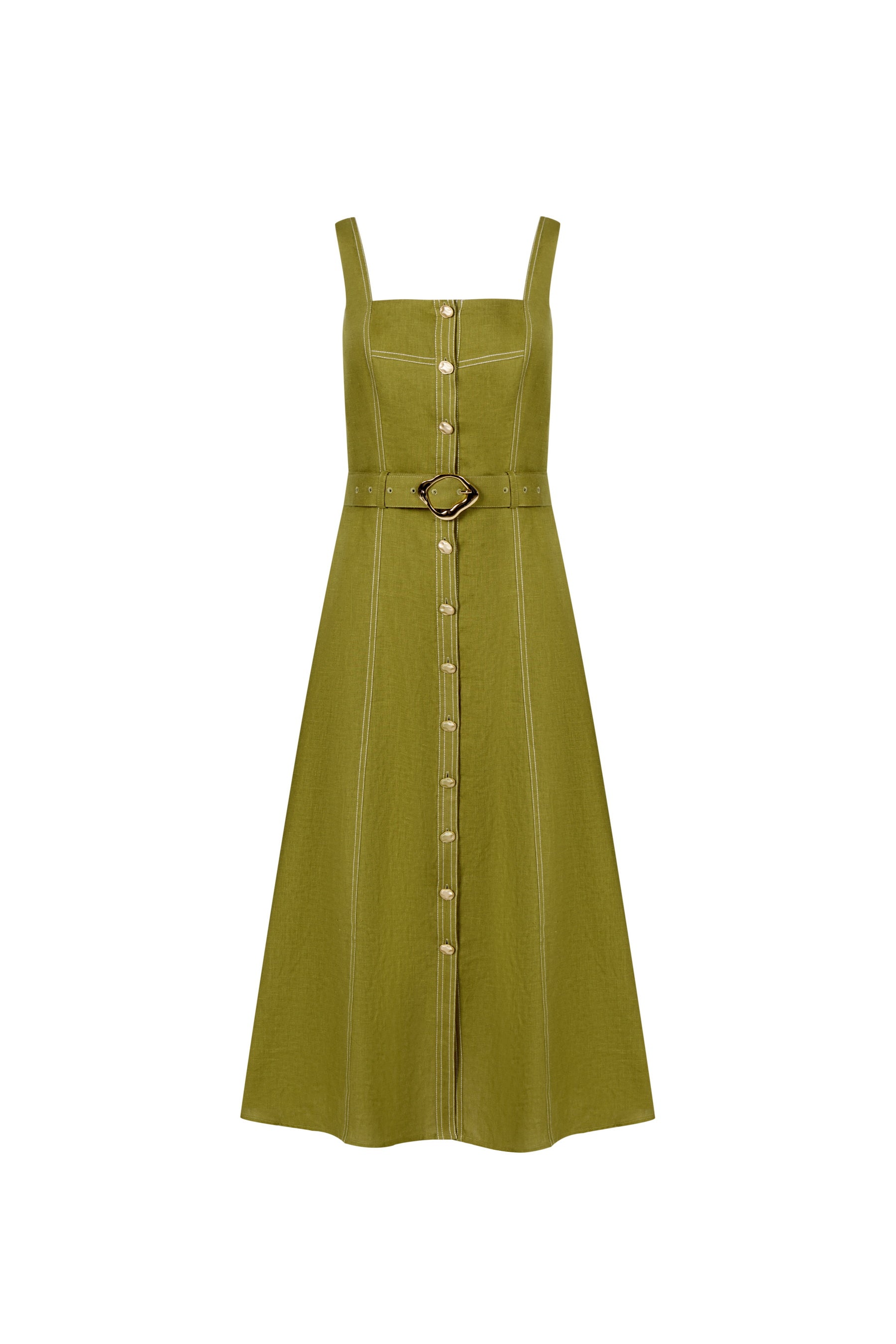 Features a square neckline, offering a modern, structured edge that frames the collarbones. A row of center-front buttons in a metallic or shell finish adds visual interest and a touch of retro charm. Cinched with a matching linen belt, detailed with a statement buckle—an oversized metallic piece in a sculptural shape that adds a bold, artistic touch. - Lined