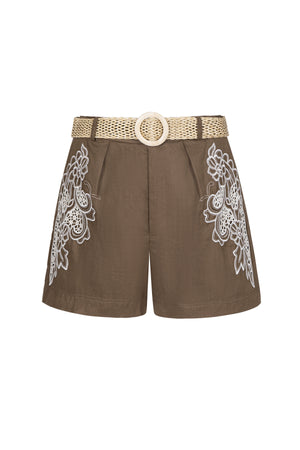 Made from crisp white linen, the fabric has a soft, airy drape with a matte, organic texture characteristic of linen. Beige-toned floral embroidery adorns both sides of the shorts, adding a delicate, artisanal touch. The floral motifs combine swirling leaves and blossoms, enhancing the feminine elegance of the design. - Lined