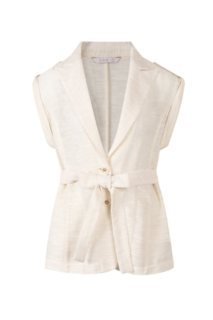Isadora vest features a structured, tailored cut with softly defined shoulders and a straight, slightly flared hemline that hits around the hips. The design blends the polish of a blazer with the ease of a sleeveless summer layer. A notched lapel collar adds a classic, tailored element. The front is secured with a single-button closure at the waist, creating a clean, minimalist look. - Lined