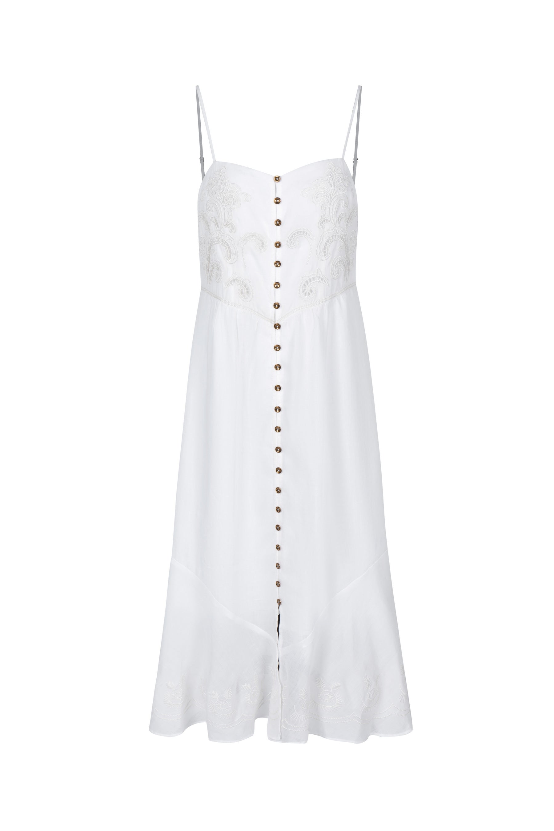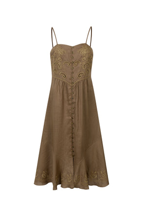 Lily above showcases a warm-toned, bohemian-inspired linen sundress that blends vintage charm with artisanal detailing. Matte, slightly crisp with a natural grain typical of linen—enhancing its organic, laid-back appeal. Intricately stitched golden yellow embroidery embellishes the bodice and hemline in a swirling, almost paisley-like motif. These ornate designs add a vintage, handcrafted element that contrasts beautifully with the simplicity of the dress's structure. - Lined