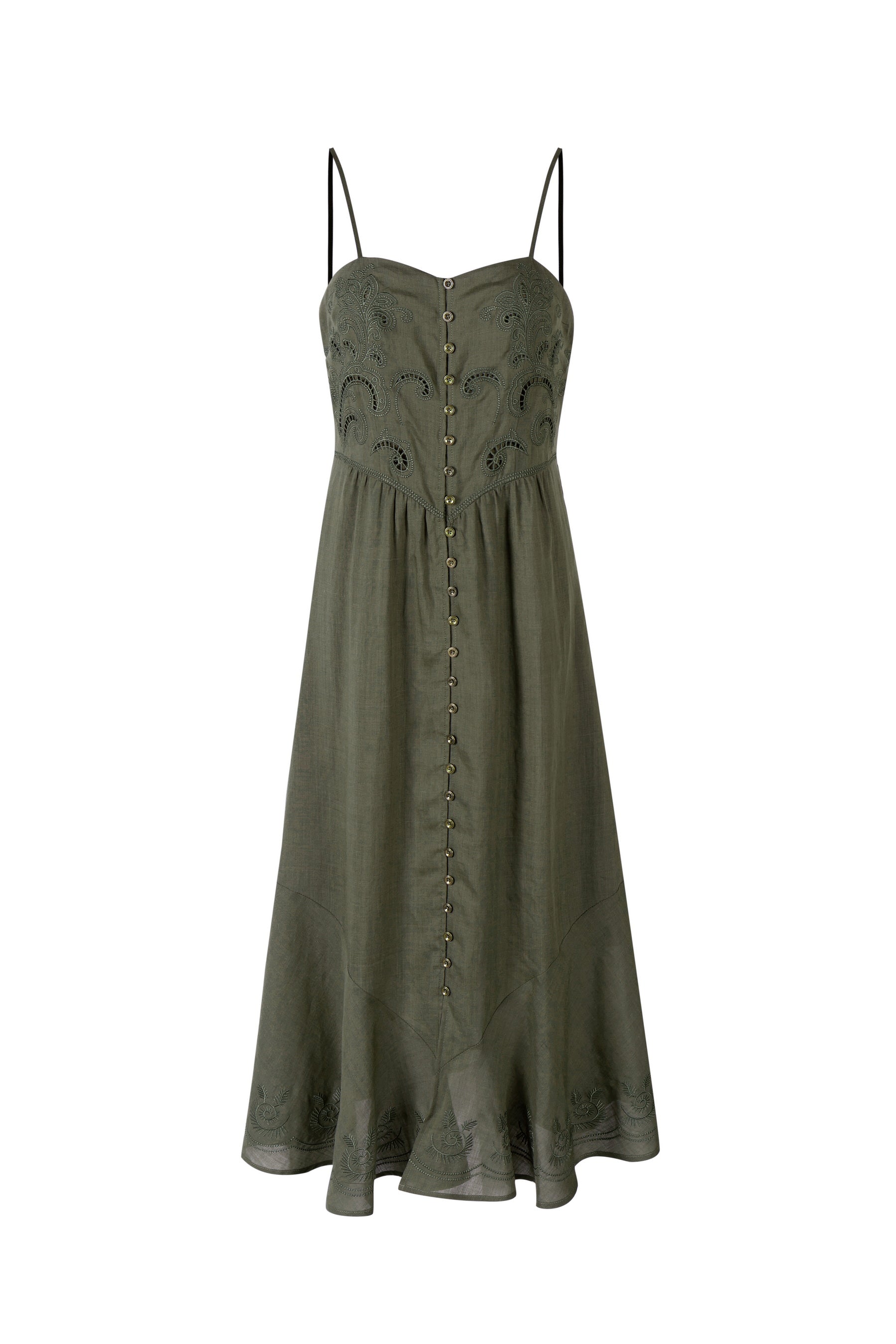 Lily above showcases a warm-toned, bohemian-inspired linen sundress that blends vintage charm with artisanal detailing. Matte, slightly crisp with a natural grain typical of linen—enhancing its organic, laid-back appeal. Intricately stitched golden yellow embroidery embellishes the bodice and hemline in a swirling, almost paisley-like motif. These ornate designs add a vintage, handcrafted element that contrasts beautifully with the simplicity of the dress's structure. - Lined