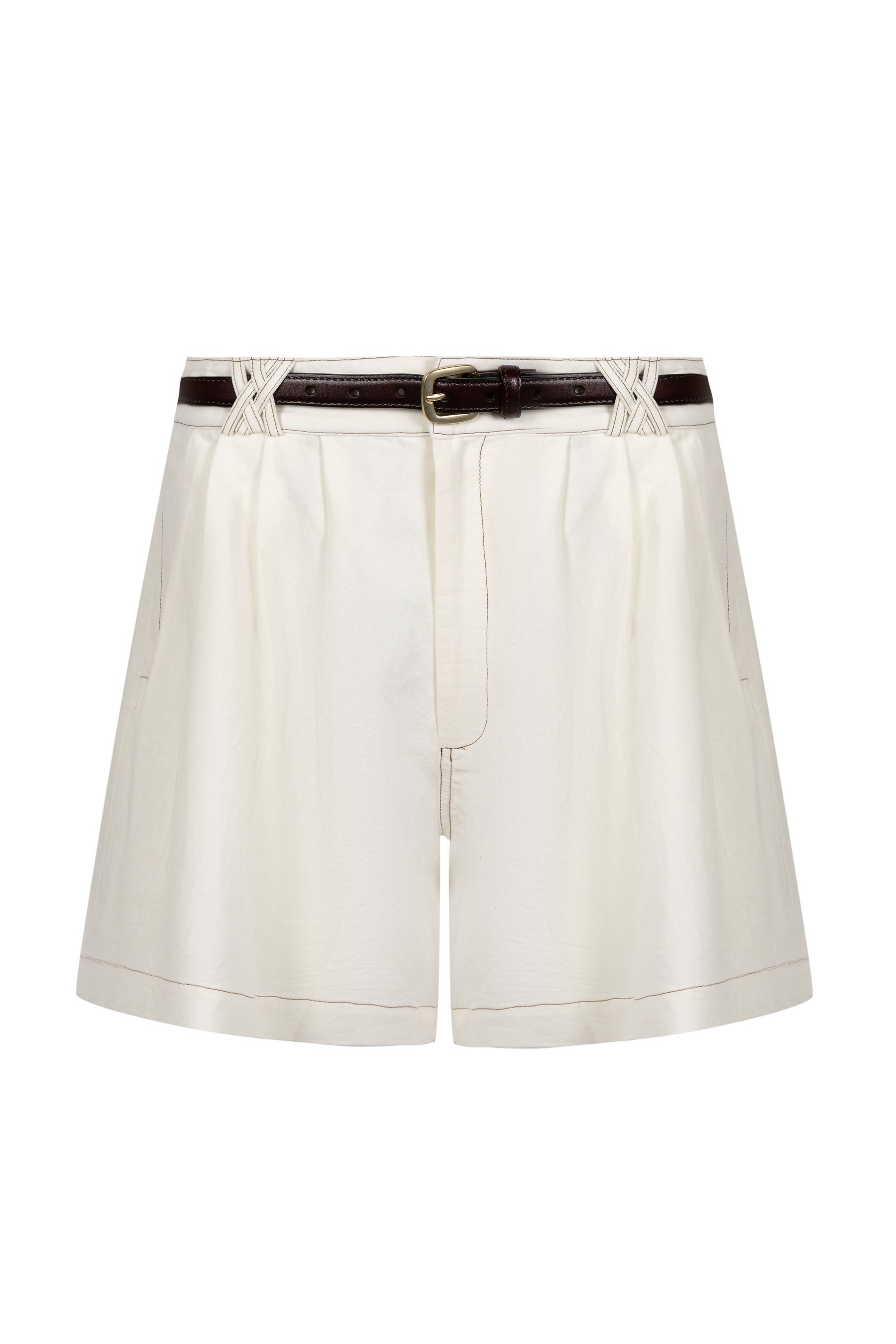 The natural cotton-linen fabric has a subtle texture and matte finish, exuding an airy, casual-elegant vibe. Lsabella shorts feature a high-rise waist, accented with decorative crisscross stitch details at the sides, adding artisanal craftsmanship. A slim, dark brown leather belt with a brass buckle threads through the waistband, providing contrast and refinement. - Lined