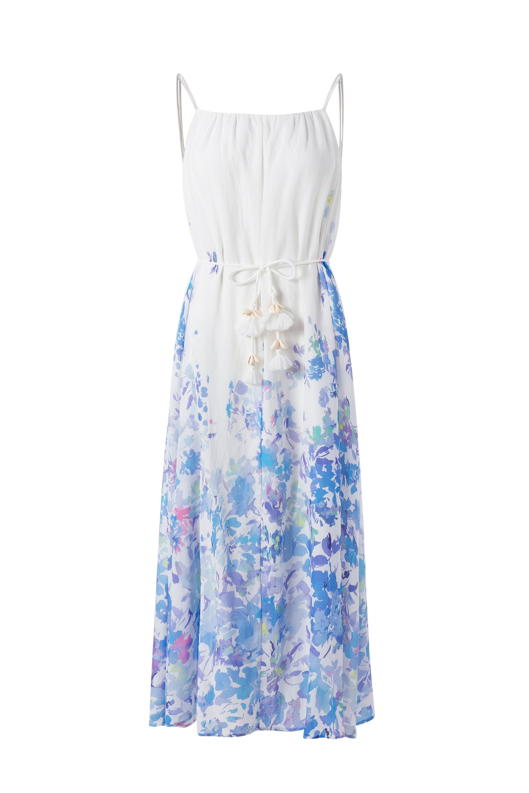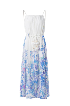 The upper bodice is a solid soft white, allowing the natural texture of the fabric to shine. Features slim spaghetti straps for a light, open-shoulder look. A drawstring waist tie, complete with ivory tassels and tiny wooden bead accents, cinches the waist for a flattering, adjustable fit and enhances the bohemian vibe. - Lined