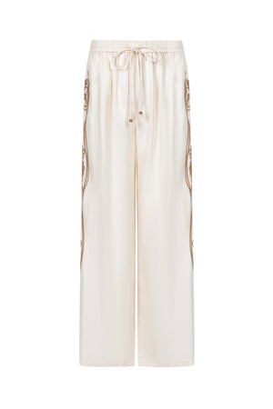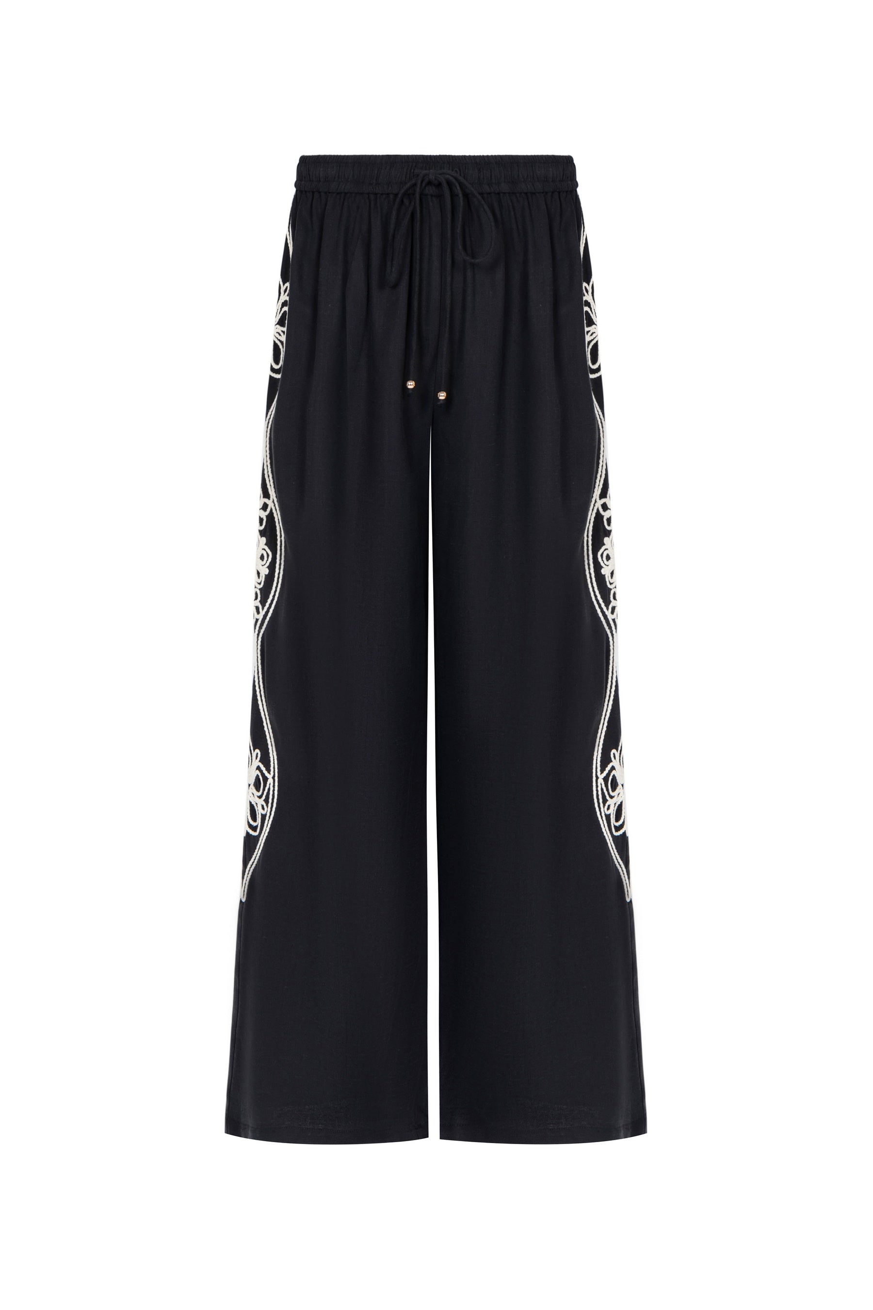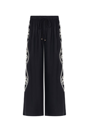 Wide-leg silhouette with a relaxed, flowy fit from hip to hem. Wide-leg silhouette with a relaxed, flowy fit from hip to hem. The side seams of both legs are decorated with white embroidered floral motifs in an elongated, vertical arrangement. Meadow pants are the perfect marriage of comfort, movement, and artisan detail—ideal for stylish everyday wear or elevated casual outings.