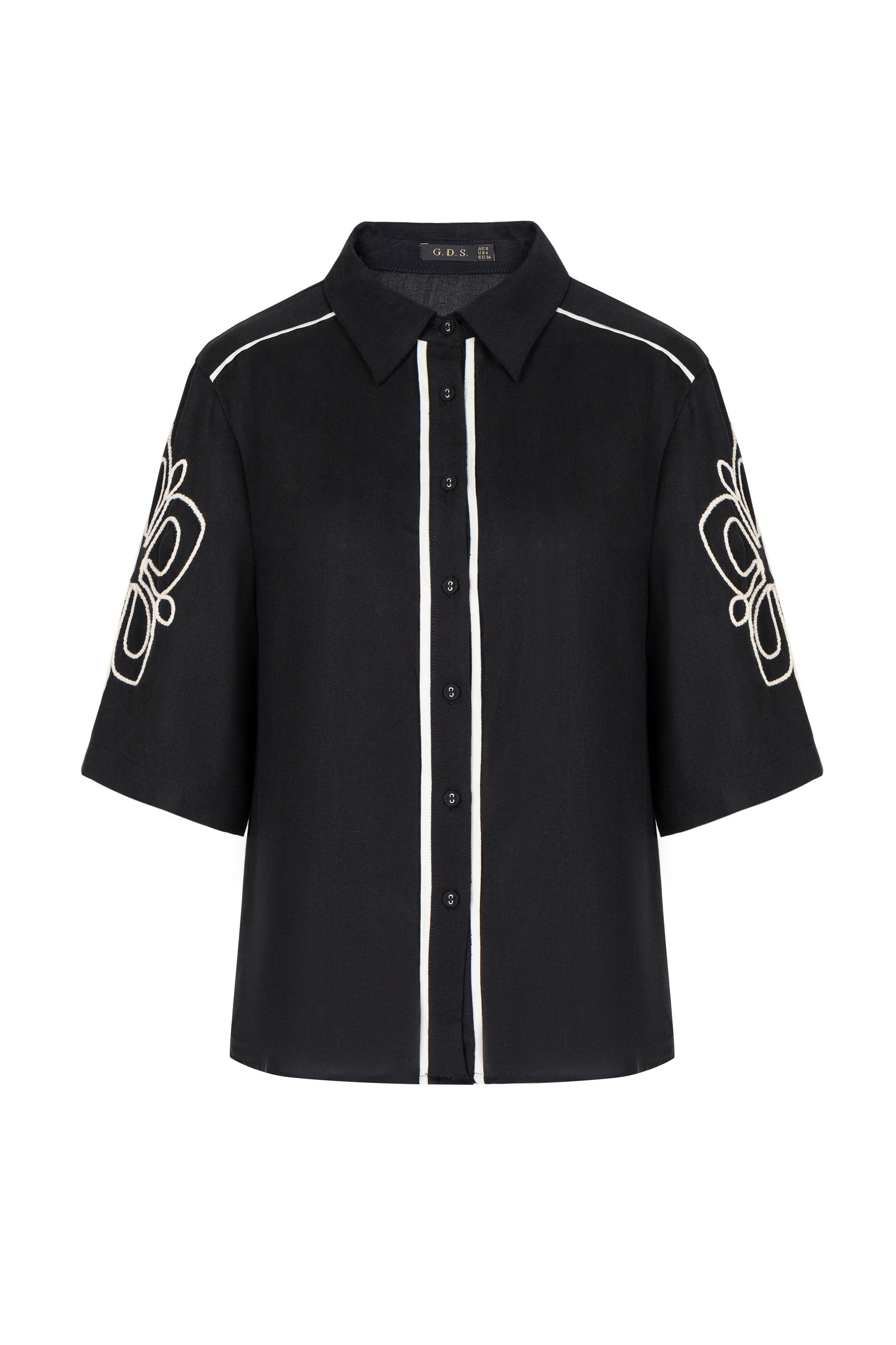 Full button-down front with white buttons and white contrast piping, which extends vertically along the placket and across the shoulders, adding structure and visual interest. Wide short sleeves feature large-scale white embroidered floral or abstract motifs, adding a soft, artistic element to the overall tailored appearance.