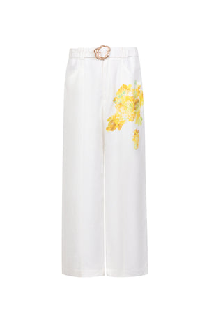 These are elegant wide-leg trousers made from a viscose and linen blend, combining breathability with a refined, softly structured drape. The base color is a pure ivory white, which provides a luminous and polished backdrop. The design resembles watercolor brushstrokes, lending the trousers an artistic, summery, and organic feel.