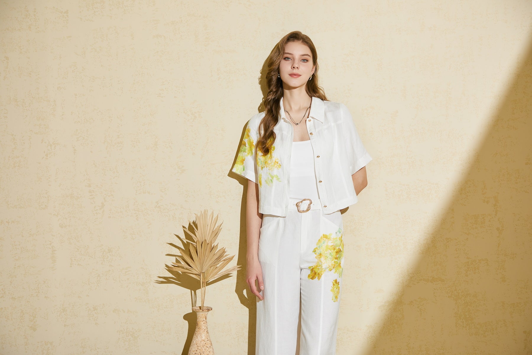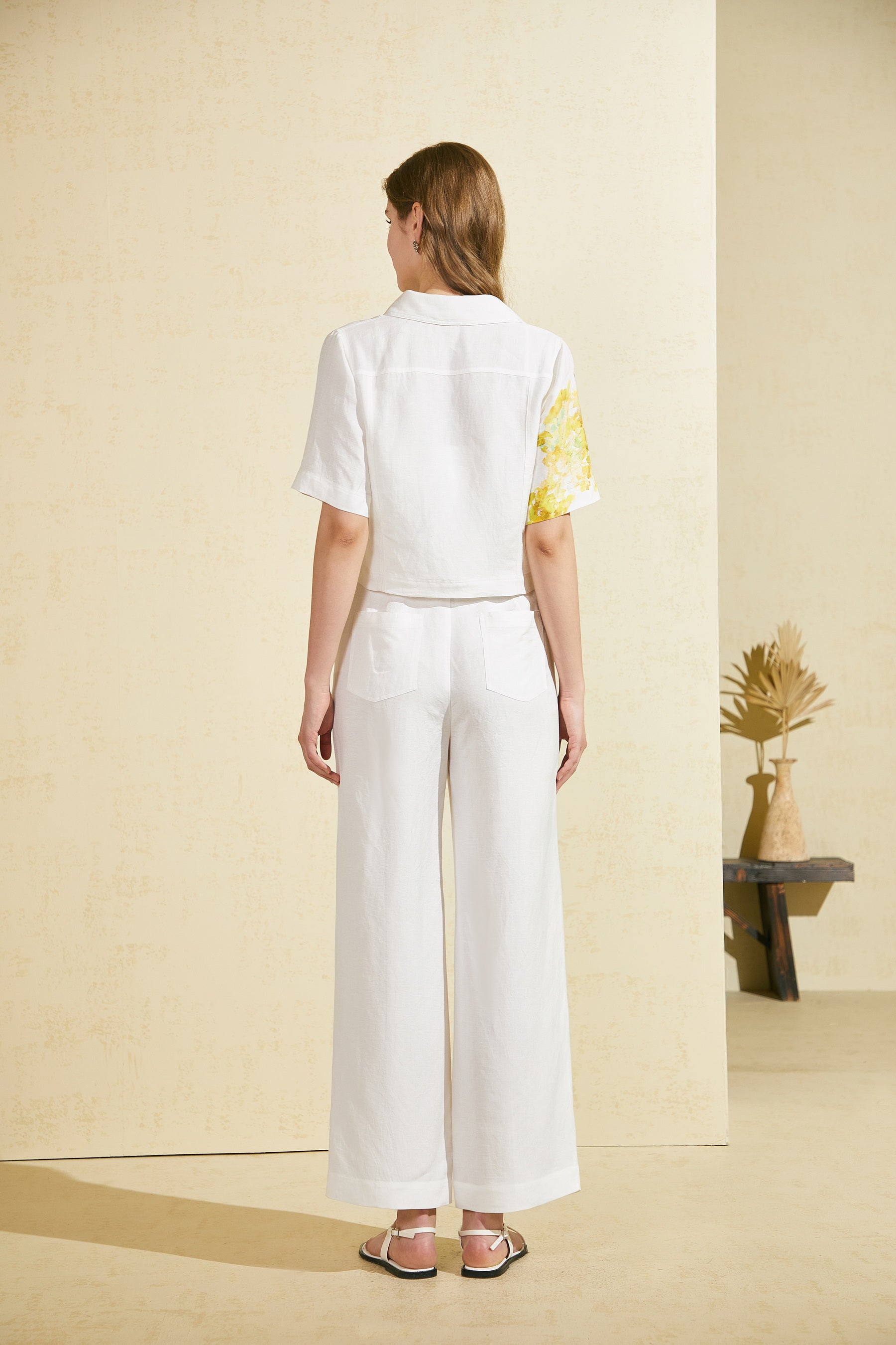 These are elegant wide-leg trousers made from a viscose and linen blend, combining breathability with a refined, softly structured drape. The base color is a pure ivory white, which provides a luminous and polished backdrop. The design resembles watercolor brushstrokes, lending the trousers an artistic, summery, and organic feel.