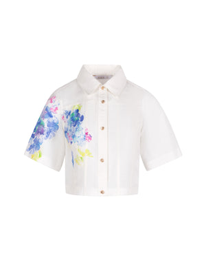 Mirabelle is a short-sleeved cropped blouse made from a lightweight blend of viscose and linen, giving it both breathability and a softly fluid drape. The design is fresh, airy, and perfect for warm-weather wear. The blouse is predominantly white, serving as a clean, versatile canvas. On the left shoulder and sleeve, there's a vibrant floral watercolor-style print accented with touches of green, evoking a summery, hand-painted feel.