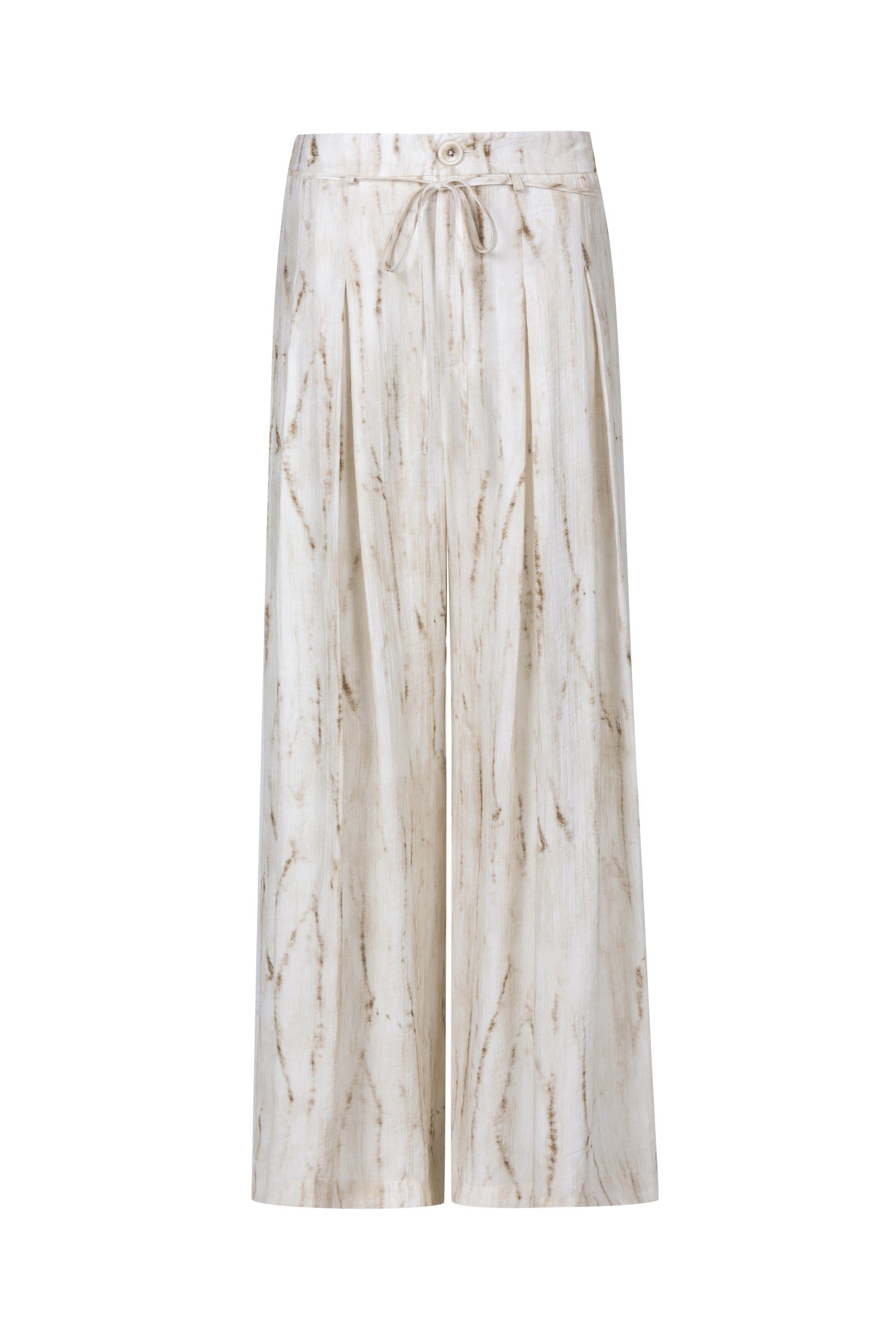 The trousers feature a high-rise waist with a flat waistband accented by a delicate drawstring tie, which is threaded through slim loops and secured at the front with a small button closure. The standout feature is the subtle marbled pattern in muted beige and sand tones on an ivory base, resembling a natural stone or woodgrain effect. This print adds visual depth while maintaining a calm, earthy aesthetic. - Lined