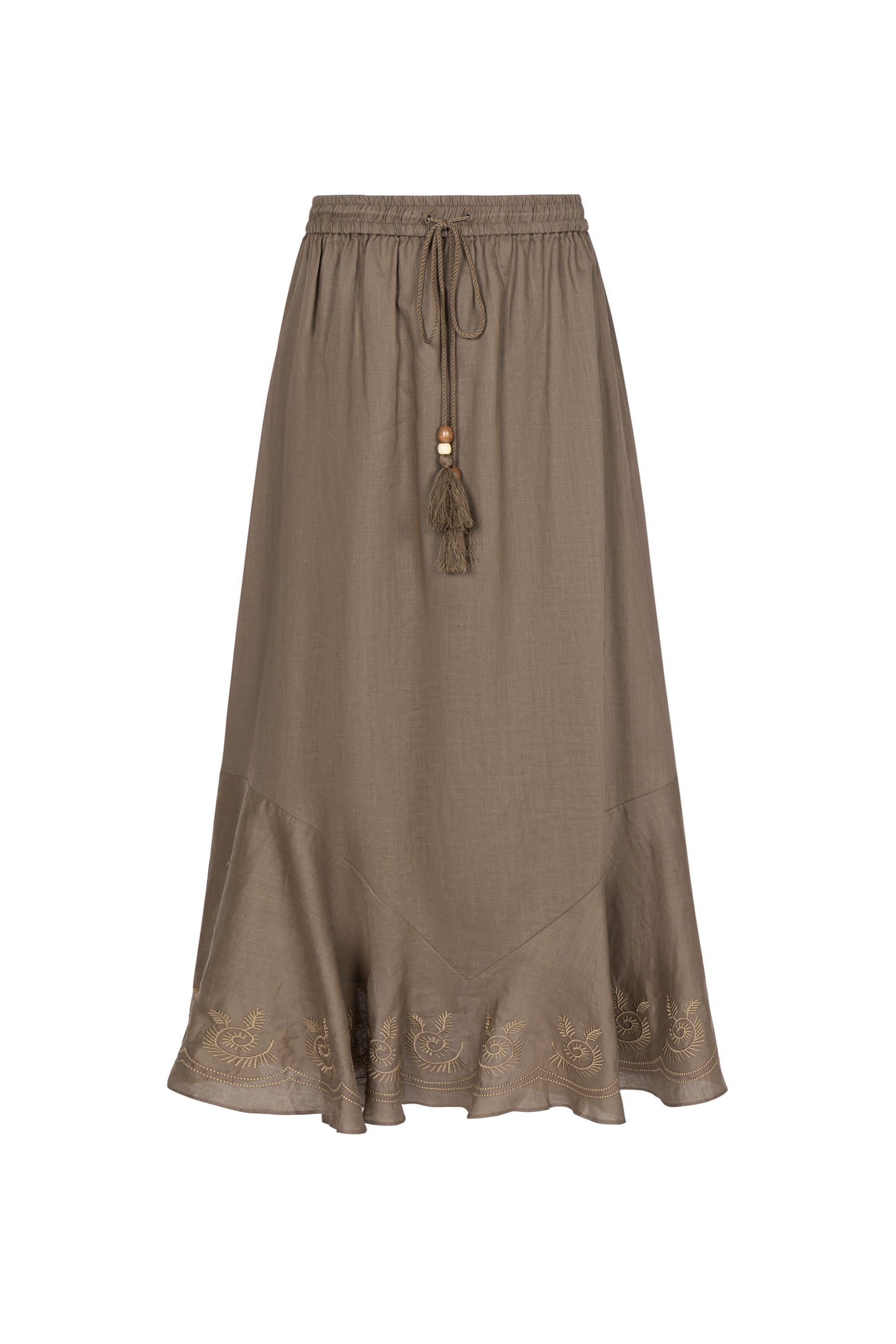 Rose shows a black midi-length skirt crafted from linen, designed with a comfortable silhouette and beautiful artisan-inspired detailing. This piece blends everyday ease with a touch of traditional flair, making it suitable for casual elegance or summer getaways. - Lined