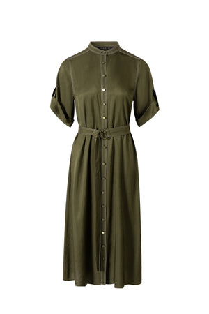 Crafted from viscose, the fabric has a smooth, silky surface with a subtle sheen. It drapes gracefully, giving the dress a polished yet comfortable look. Features a stand collar (band collar) that keeps the neckline minimal and modern. Contrasting topstitching in white creates defined lines along the placket, collar, and seams, adding visual structure and a slightly utilitarian edge.
