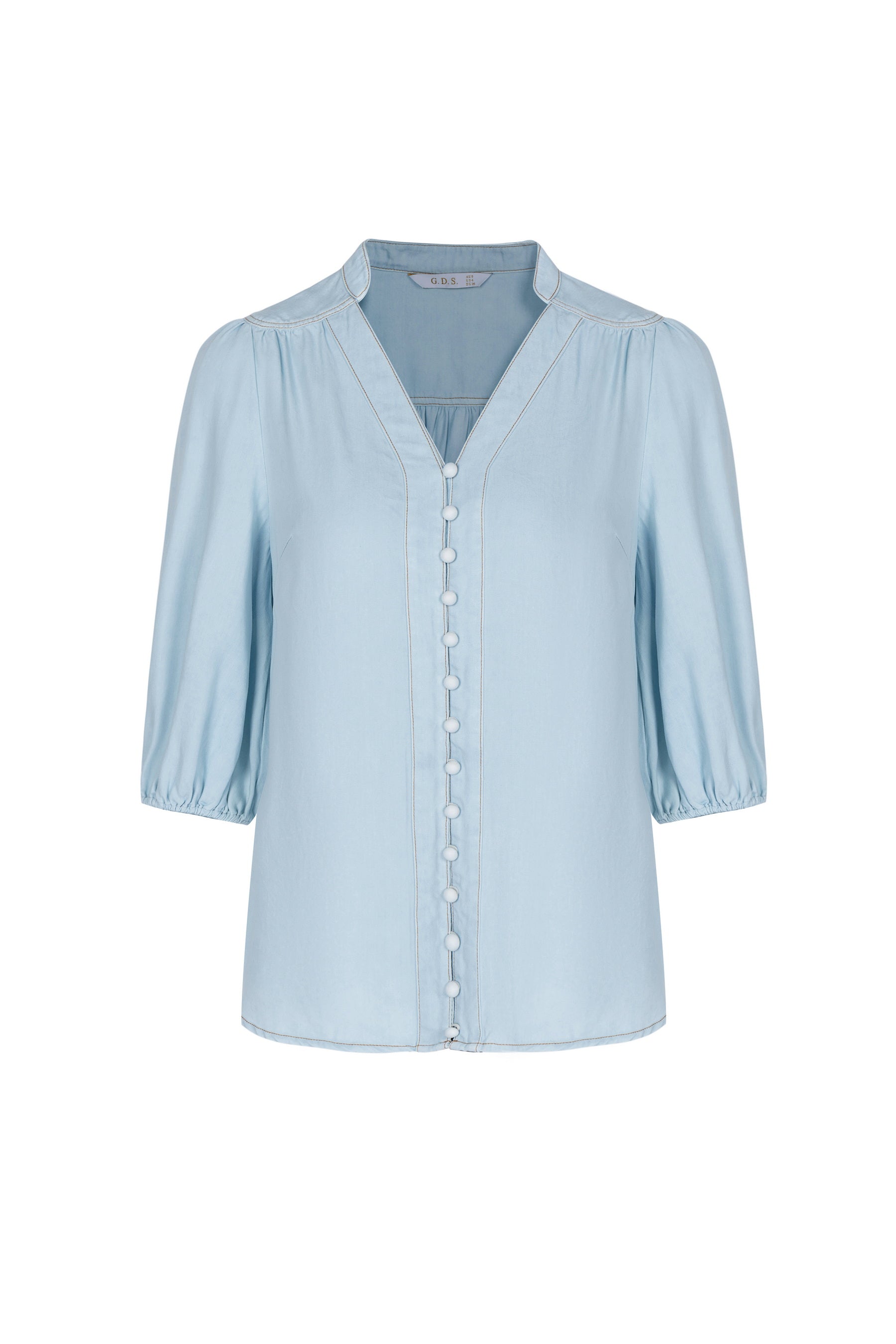 Selene shows a light blue blouse made of Tencel, a sustainable fabric known for its silky-smooth texture, breathability, and elegant drape. The design features a gentle V-neckline framed by a narrow standing collar that opens gracefully into the button placket. The front is adorned with a row of fabric-covered buttons, giving the blouse a classic, feminine touch. Each button is meticulously placed, adding structure and balance to the fluidity of the Tencel fabric.