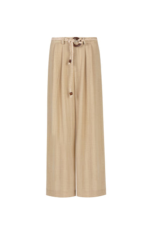 The fabric has a slightly crisp, slubbed texture, typical of linen-blend textiles, adding a touch of rustic charm. High-rise waist with a straight, wide-leg cut that falls fluidly to the ankles. Subtle pleats below the waistband give the pants a touch of volume without compromising the clean, vertical flow.