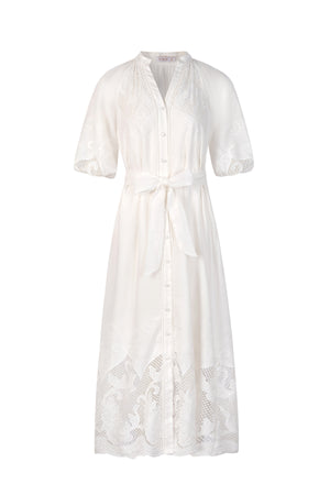 Share our elegant embroidered dress, a perfect blend of sophistication and comfort. This dress features a flattering V-neck design that beautifully frames the neckline. The elasticized cuffs add a touch of refinement while ensuring a comfortable fit at the wrists.The placket is adorned with delicate lace detailing, enhancing its charm and making it a standout piece. With shoulder seams that create a stylish raglan silhouette, this dress offers both ease of movement and a modern look.-Lined