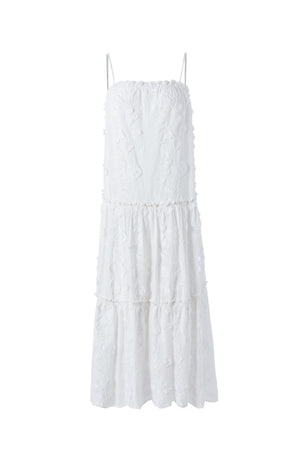 Victoria features a dreamy and delicate white sundress crafted entirely from cotton, showcasing a breezy silhouette adorned with textural floral embroidery. This dress beautifully captures the essence of effortless summer elegance with a romantic, bohemian twist.